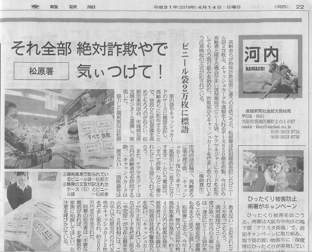松原市薬剤師会と松原警察署がタイアップして、会員薬局で特殊詐欺の手口を記した啓発用レジ袋を使い被害啓発の声がけを行っています。(読売新聞朝刊)