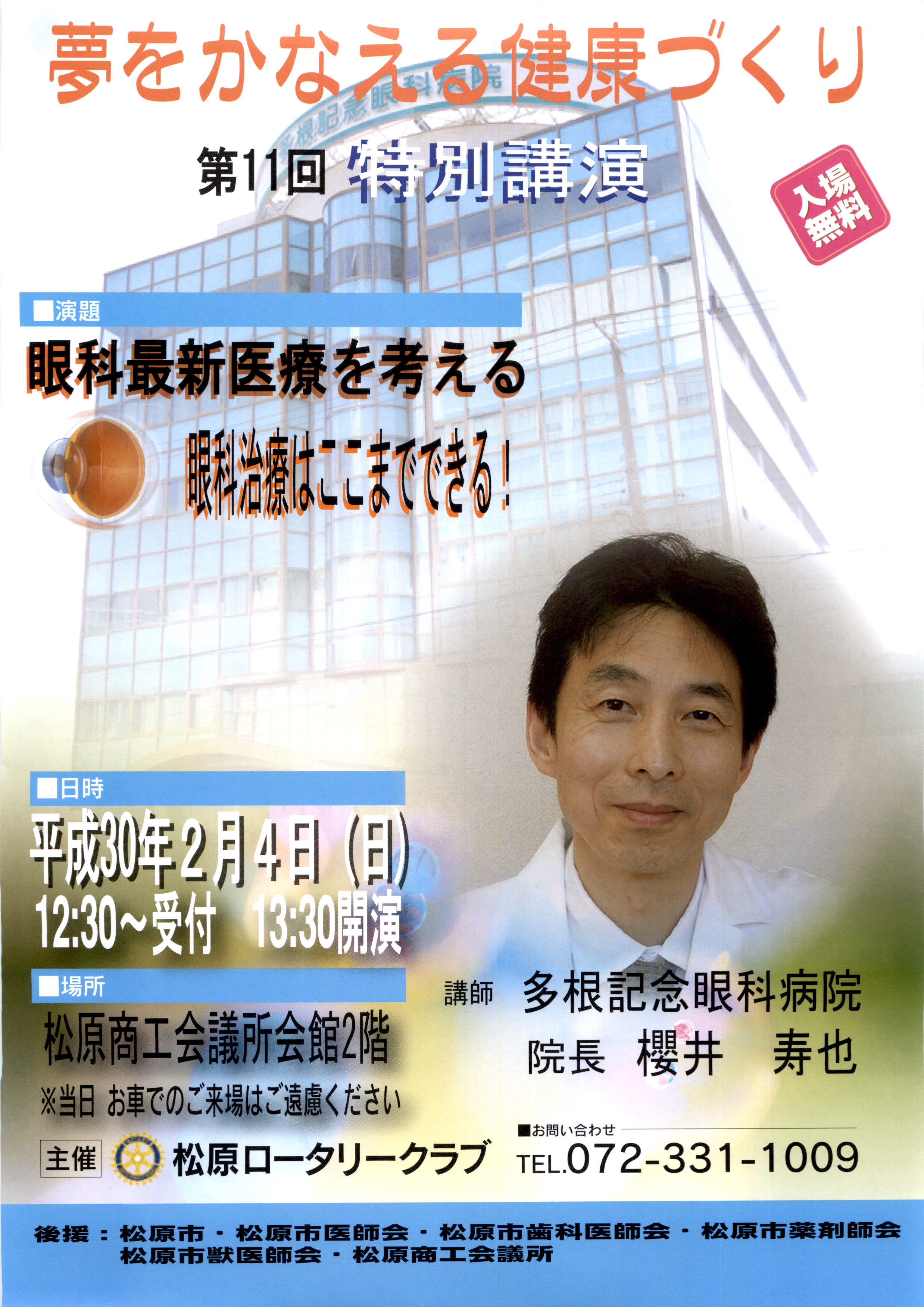 夢をかなえる健康づくり 夢をかなえる健康づくり 第11回特別講演 『 眼科最新医療を考える 』 眼科治療はここまでできる! 講師;多根記念眼科病院 櫻井寿也 院長 日時;平成30年2月4日(日) 13:30~ 場所;松原商工会議所2階 ※ 多数のご参加ありがとうございました。 主催;松原ロータリークラブ 問い合わせ;072-331-1009 後援;松原市、松原市医師会・歯科医師会・薬剤師会・獣医師会、松原商工会議 夢をかなえる健康づくり