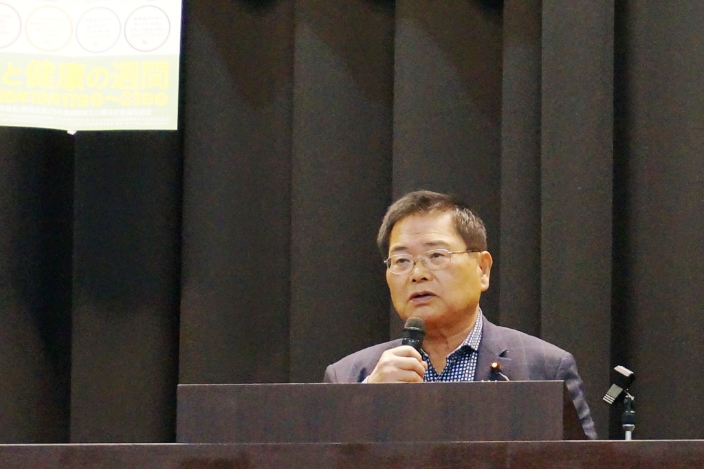 - 来賓あいさつ 市長メッセージ代読、市議会議長、符議会議員、衆議院議員2名、府薬会長