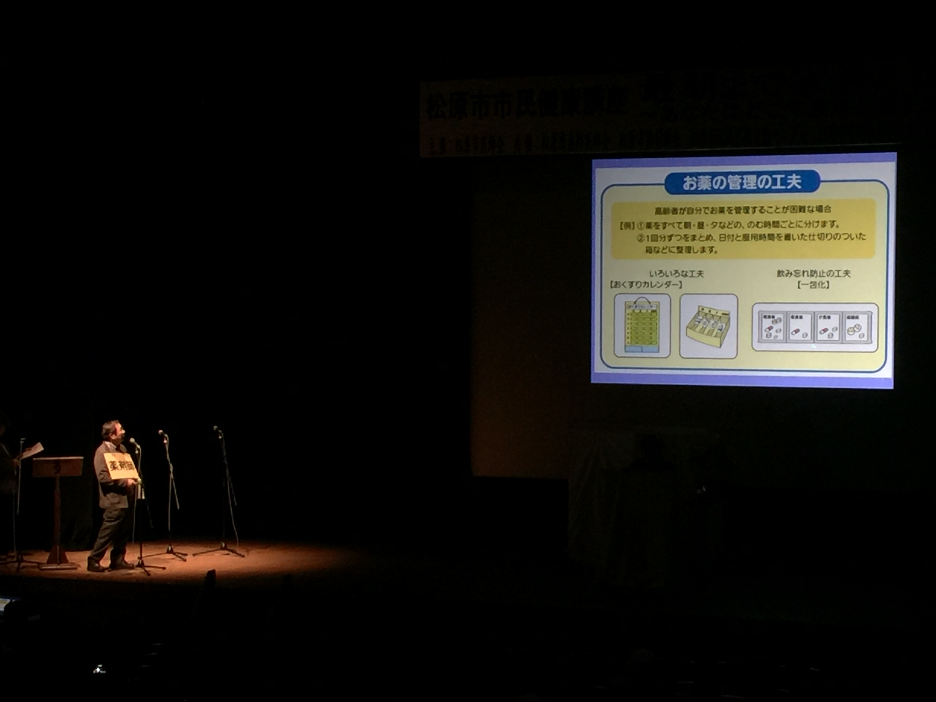 1部の講演は、高齢者に多く見られる疾患(高血圧、糖尿病など)の薬剤で起こりやすい副作用や、食品と薬との相互作用などについてでした。