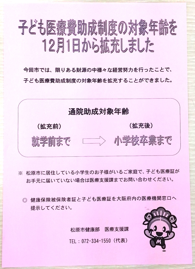 平成26年12月1日より、松原市は医療費助成制度の対象年齢を、小学校卒業までに拡充しました。