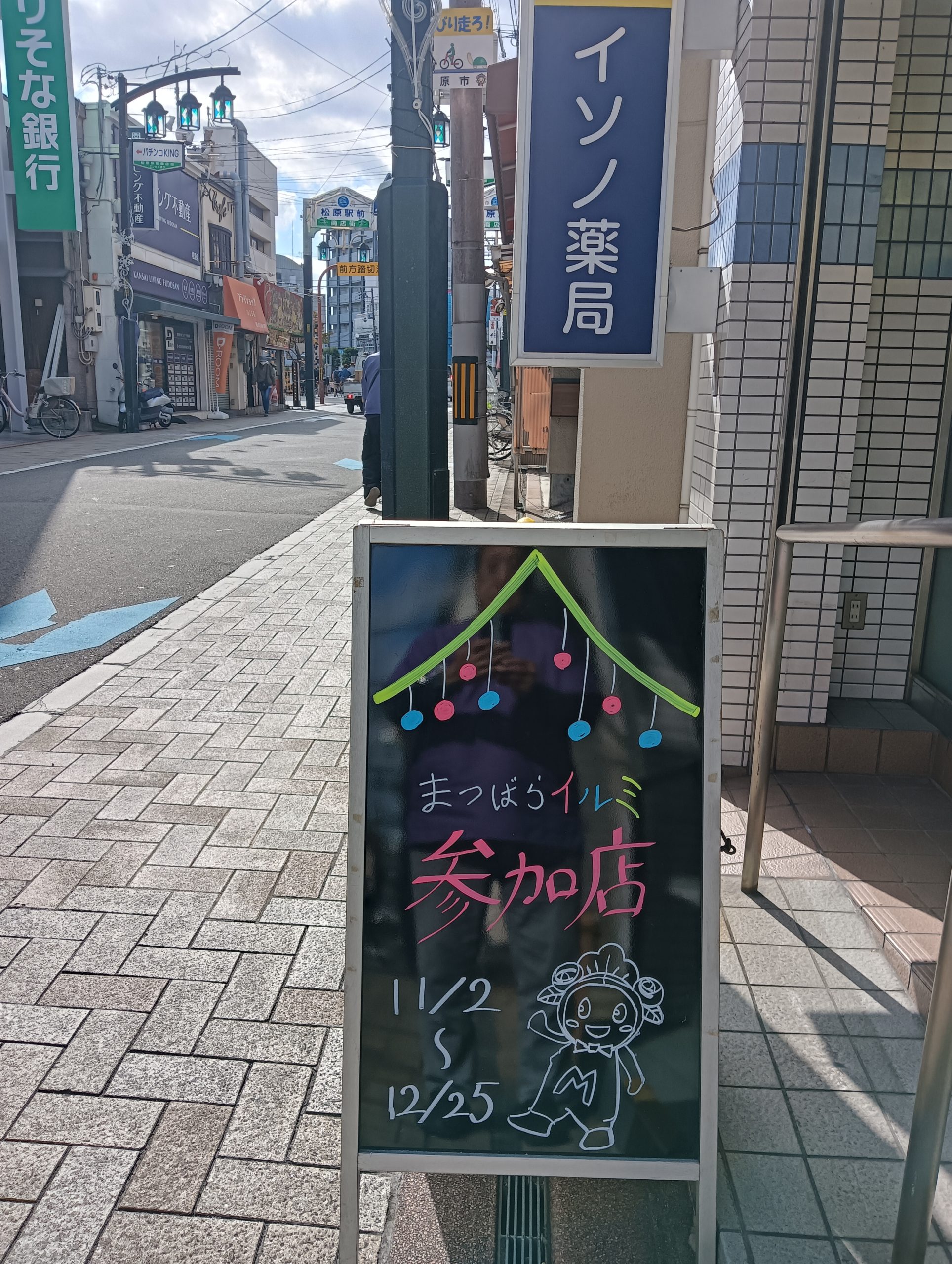 11月4日 ~ 30日の期間中に、イルミネーションを撮影してご提示いただくと、イソノ薬局店内商品が15%引きになります。お得にお買い物が出来ます。(処方せんは除く)