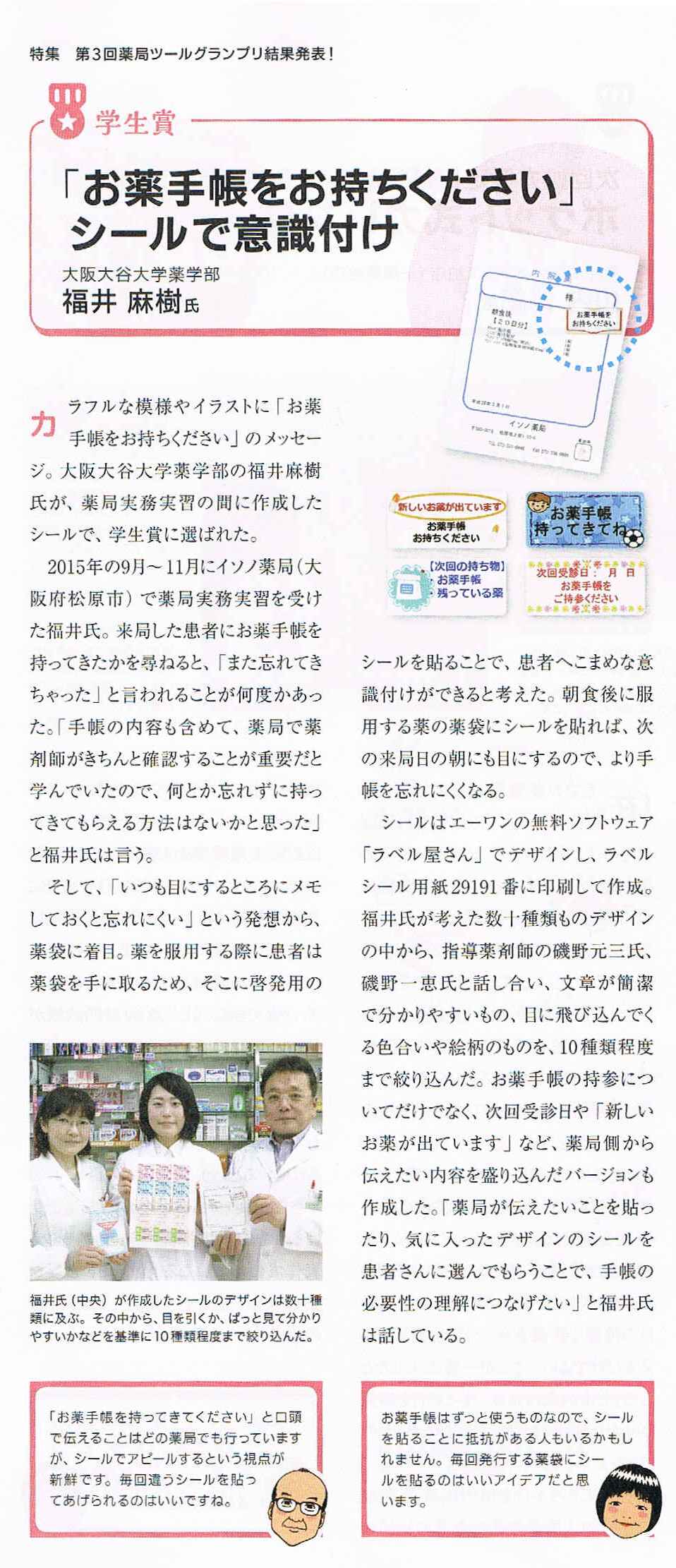 日経DI 第3回薬局ツールグランプリで、イソノ薬局実習生 福井麻樹(大阪大谷大学)さんが学生賞を受賞しました。熱心に、意欲的に実習に取り組まれた結果が出ました。